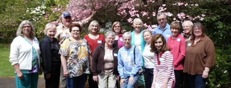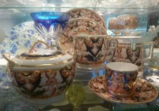 Shelley enthusiasts arrived in Oregon just in time to see the Spring colors in full bloom on a perfect Spring Saturday, April 27. The wisteria, azaleas, rhododendrons, and dogwood trees all competed with each other to create a stunning array of color as we wound our way up to the house. After all 14 guests had arrived we took advantage of the beautiful day by taking a photo of the group under a flowering pink Dogwood tree. Back in the house we were treated to a tour of the Shelley rooms and displays. With so many beautiful and rare pieces, it was difficult to pick a favorite, but we all agreed that Phyllis's latest buys were superb examples of the best of the late 1800’s Wileman Foley: The Hawthorne Blossom Daisy shaped trio (6327), and the Alexandra Japan Red tea set on matching tray (4024). In the "All-White Shelley" room, none of us had seen the very rare shapes of Ideal (Wileman) and Spiral (Foley/Shelley) in person before. Phyllis mentioned that she had been told the demitasse Spiral-shaped c/s may have been designed for the Navy, as the extra deep well in the saucer would keep the cup from sliding around in the roughest of conditions.