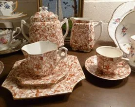 Spirits were as high as balloons in the Albuquerque sky as NSCC members from around the US gathered to celebrate and learn about Shelley china on September 14-17. The festivities started with a high tea at the St. James Tea Room. Everyone joined in the fun by wearing stylish hats provided by the hosts. The various teas and savories and sweets were scrumptious. Registration began on Friday followed by the Annual Pot Show, Orphan sale and Welcome Party. Numerous members assisted the conference organizers with registration and their efforts are much appreciated. Friday evening festivities culminated in a fascinating talk given by Elixir Chocolate company of Albuquerque. Not only did the owners of the shop demonstrate how to make chocolate truffles, but they distributed samples of their delicious wares delighting everyone in attendance. After a brief breakfast, attendees commenced our traditional program with talks on the Shelley Pattern Books, Shelley & Wileman Hunting Scenes, Japan Ware, and Moire followed by the traditional All Shelley Sale. Sunday commenced with the Annual Meeting following by programs on Regional Meetings, Selling Shelley, Shelley Manufacture, Black and White Dog Crested Ware, and “Shotgun” collecting. The day closed with the Gala Banquet complete with a Silent Auction, Raffles, and announcement of the Douglass and Leiser Awards.