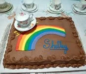 Buffet lunch in the dining room was a delicious assortment of hot hors d'oeuvres, mixed fruit bowl, cold meats, buns and sandwiches. On the bottom of one of the different Shelley place settings at the table, was a teapot decal that made that plate holder, Richard, the winner of another Shelley cup and saucer. The Chocolate cake dessert was so delicious that it was almost worthwhile cutting into the perfectly inscribed Shelley logo decorating the icing top. We all had a chance to look over the Sales table carefully throughout the afternoon, and pieces were put in safe spots for purchasing at the end of the day. No one wanted to say good-bye, but instead hoped to meet again in September at the Shelley Conference in the Washington, D.C. area. A great day was had by all.