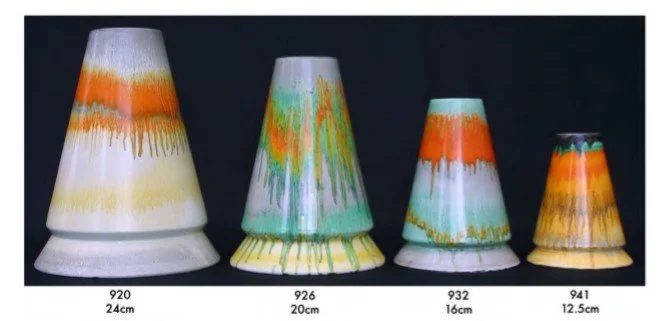 In the 1930s Shelley produced a range of colourful effects on earthenware and china. The earthenware include wall chargers, ginger jars, toast racks, candlesticks, jugs and many more. This technique involved applying colors in various shades which were applied and then allowed, or helped by spinning, to drip and blend together into a pleasing artistic pattern, each truly unique but similar to the other.