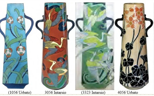 Elizabeth Waterhouse (1834-1918) ran a village workshop where she designed a particular decoration in brass which formed the basis for a Wileman shape of vase that ended up being made in six sizes (6 inch to 24 inch) and being used in Urbato (five patterns on four sizes) and Intarsio (eight patterns on six sizes). 18 illustrations follow.